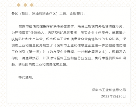 涉及進口物資的企業(yè),要嚴格按照“雙固定、一監(jiān)控、一臺賬”(固定場所作業(yè),固定重點崗位人員,攝像頭監(jiān)控,一套臺賬)要求做好重點進口物資防控工作,強化進口物資集中拆封、消毒等。具體工作要求按照《深圳市境外輸入物品疫情防控工作指引》《深圳市工業(yè)和信息業(yè)企業(yè)、中小企業(yè)進口物資廠區(qū)(園區(qū))內(nèi)疫情防控工作指引》執(zhí)行。