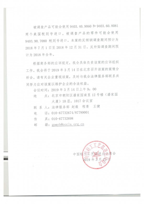 根據(jù)商務(wù)部的應(yīng)訴規(guī)定,我會(huì)具體負(fù)責(zé)該案的應(yīng)訴組織工作。我會(huì)將于2019年3月14日在北京召開該案的案情分析會(huì)。請(qǐng)有關(guān)企業(yè)重視該案,及時(shí)與我會(huì)法律服務(wù)部聯(lián)系共同努力應(yīng)對(duì)該案以維護(hù)企業(yè)的合法權(quán)益。