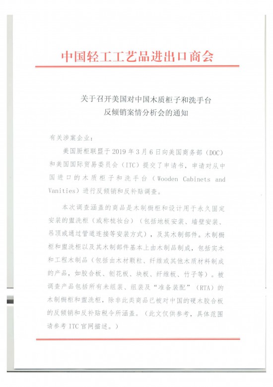 美國(guó)廚柜聯(lián)盟于2019年3月6日向美國(guó)商務(wù)部(DOC) 和美國(guó)國(guó)際貿(mào)易委員會(huì)(ITC)提交了申請(qǐng)書,申請(qǐng)對(duì)從中國(guó)逬口的木質(zhì)柜子和洗手臺(tái)(Wooden Cabinets and Vanities)進(jìn)行反傾銷和反補(bǔ)貼調(diào)查。