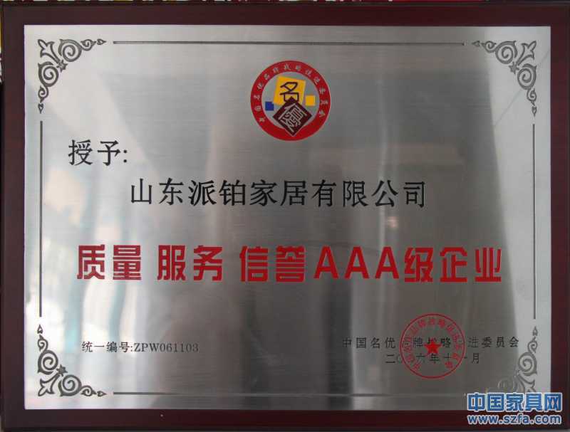 證書介紹 派鉑家居榮獲“質(zhì)量、服務(wù)、信譽(yù)AAA”企業(yè)。