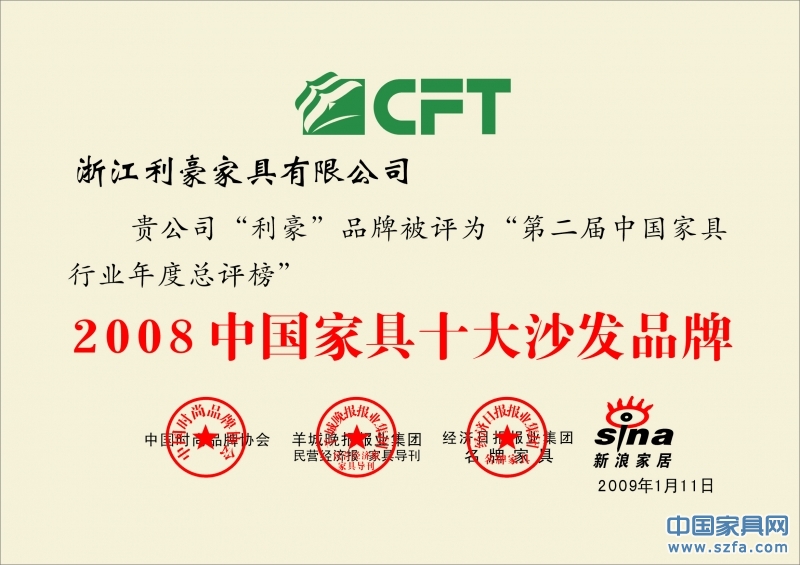 榮譽(yù)資質(zhì) 2008年中國(guó)家具十大沙發(fā)品牌