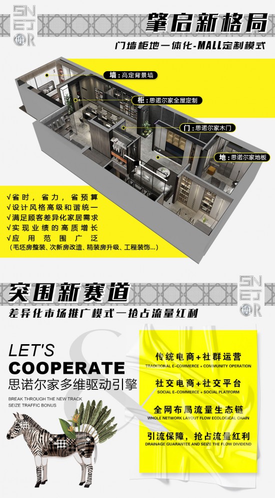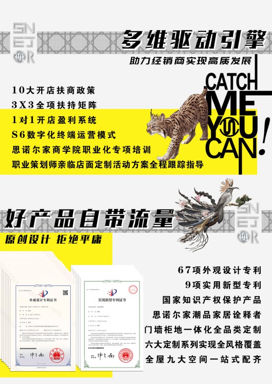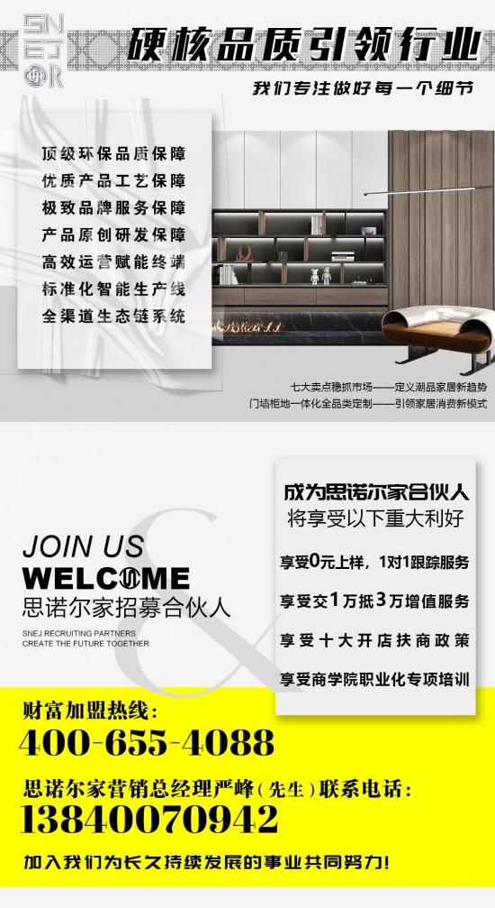 隨著國內消費者需求越來越趨向于差異化,具備個性化和創(chuàng)新思維的家居品牌越來越受消費者的青睞。思諾爾家全面布局渠道流量生態(tài)鏈,為終端經銷商多維助力,通過調整產品及服務,順應市場發(fā)展趨勢,憑借強大的研發(fā)設計團隊,將潮品家居與環(huán)保健康融合的家居理念推行,成為引領行業(yè)風向標。思諾爾家將繼續(xù)聚焦行業(yè)發(fā)展趨勢,全方位賦能經銷商發(fā)展,公司更是針對經銷商的日常管理進行商學院職業(yè)化培訓,資深活動策劃師駐店指導等,令思諾爾家的終端旗艦店完成從定制門店到定制服務商的轉變,極大滿足了顧客的家居需求,更實現了業(yè)績的快速增長。全方位的保障為經銷商們帶來輕資產、高回報以及更強的抗風險能力,實現經銷商與品牌的高質發(fā)展!