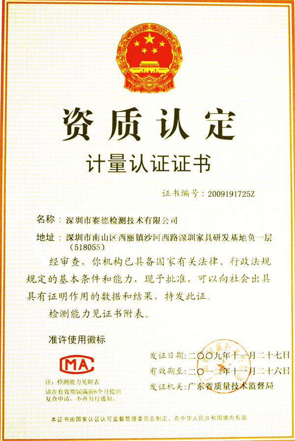 專業(yè)的團(tuán)隊(duì)打造合格的資質(zhì):深圳市賽德檢測技術(shù)有限公司已獲得CNAS國際實(shí)驗(yàn)室認(rèn)可和CMA國家計(jì)量認(rèn)證資質(zhì)。