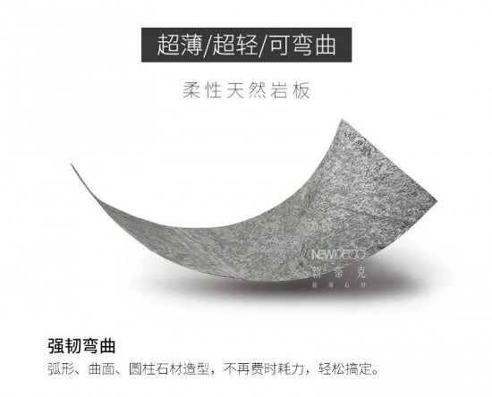 成品厚度1-3mm,每平米重量約1.5kg左右,其產(chǎn)品具有天然石材質(zhì)感,超輕,超薄,強(qiáng)韌可彎曲,可透光等特點(diǎn),最大限度提升石材利用率,為節(jié)省能源,降低運(yùn)輸與安裝消耗做出巨大貢獻(xiàn),不但改變了多年來使用粗石材的歷史,更因其獨(dú)特的自然紋理,超強(qiáng)的任性和可進(jìn)行極限彎曲的特性,為石材裝飾創(chuàng)造了更多的可能性。