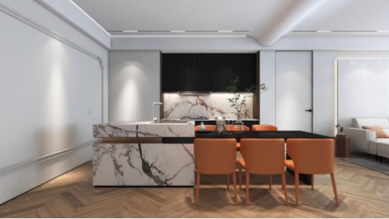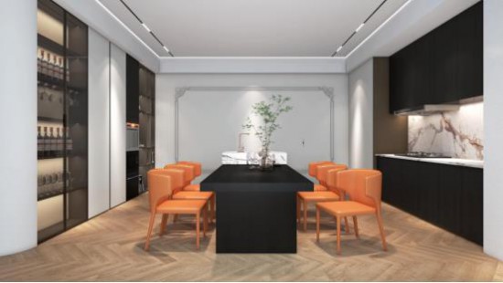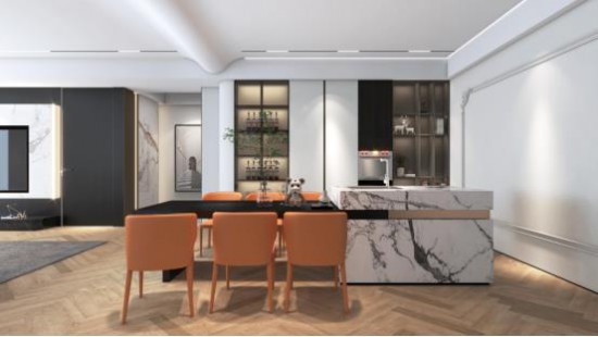 大理石中島臺,潑墨紋理自然靈動,智能推拉滑軌設(shè)計,集吧臺、餐臺于一體,搭配愛馬仕橙色CBD家居·金豹 | J002餐椅,熱情活力,空間足以承載多元生活場景,演繹靜雅而時尚的東方美學(xué),為歡聚時刻增添新意。