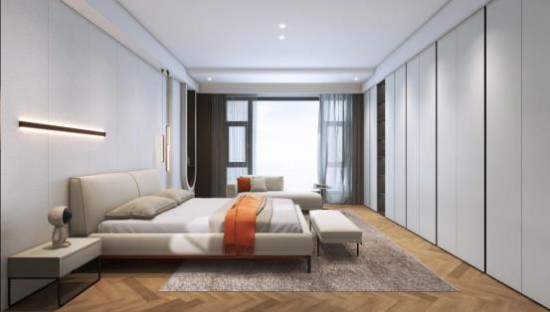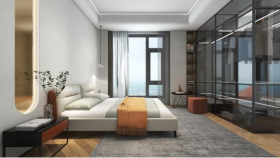 完美利用大平層的優(yōu)勢,主臥依據(jù)比例分割,間以灰色透明玻璃柜隔斷,光影朦朧中感受空間的虛實寫意。