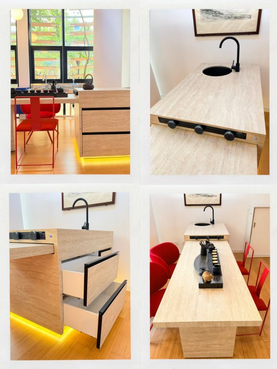 - 功能切換:可做餐桌、茶臺(tái)或臨時(shí)工作臺(tái),搭配電力導(dǎo)軌和金屬水槽,也可升級(jí)為升降插座、電磁爐。