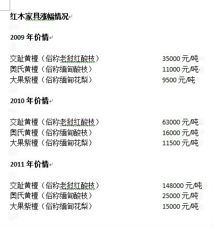 從國內某知名紅木家具生廠商提供的原材料價格清單來看,從2009年至2011年,各類紅木家具的原材料成本較之過去呈現(xiàn)翻倍增長趨勢。根據(jù)清單顯示:老撾紅酸枝2009年價格僅為35000元/噸,2010年翻番價格上升為63000元/噸,2011年9月份又在2010年基礎上翻番,成交價為148000元/噸;緬甸酸枝則在2009年的11000元/噸,價格飛漲到如今的25000元/噸;就連紅木家具中較為便宜的緬甸花梨,價格也從2009年的9500/噸上漲到目前的15000元/噸。