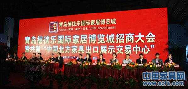 2011年10月29日上午,伴著朵朵綻放的禮花和整齊有序的鑼鼓聲,在一片喜慶歡樂的氣氛中,青島禧徠樂國際家居博覽城招商大會暨共建“中國北方家具出口展示交易中心”典禮隆重舉行。