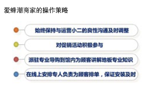在體驗店中,有一個花梨木的賣家做得非常好, 他專門派駐了一位銷售人員進行現(xiàn)場解說,這直接促 進了消費者的網(wǎng)上下單。當(dāng)淘寶通過線上往線下帶來 人流量的時候,有準備的商家就會抓住機遇,極力促 進銷售。在家居領(lǐng)域,消費者的專業(yè)知識明顯是不夠 的,很多時候需要銷售人員的講解,因此愛蜂潮也順 帶解決了互聯(lián)網(wǎng)品牌的另一個短板——如何讓消費者 相信你。