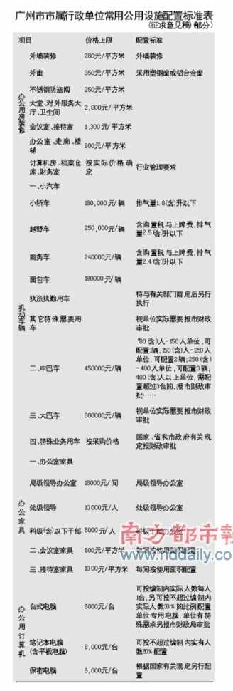 近日,廣州市財(cái)政局在其主頁(yè)上掛出《廣州市市屬行政單位常用公用設(shè)施配置標(biāo)準(zhǔn)(征求意見稿)》廣征民意,財(cái)政局稱,這是由于2008版的《配置標(biāo)準(zhǔn)》“有些標(biāo)準(zhǔn)不能適應(yīng)實(shí)際工作要求需要調(diào)整”。