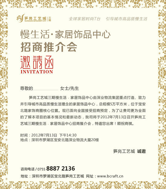 筍崗工藝城三期慢生活﹒家居飾品中心由深業(yè)物流集團(tuán)重點(diǎn)打造、致力并引導(dǎo)城市高品質(zhì)慢生活理念的家居飾品中心,總規(guī)模5萬平方米,位于寶安北路家飾商圈核心位置?,F(xiàn)已面向全國接受招商預(yù)定,為了讓貴單位更為全面的了解本項(xiàng)目的基本情況和最新動(dòng)態(tài),我司擬于2012年7月13日召開筍崗工藝城三期慢生活﹒家居飾品中心招商推介會(huì),特邀您在百忙之中出席!順祝商祺。