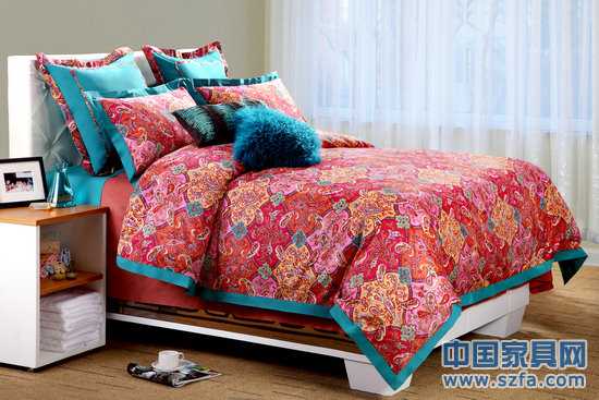 這是一款濃烈色調的床品,鮮艷的紅與飽和的孔雀藍色的激情碰撞,大膽撞色演繹濃郁的西域風情,如此完美搭配卻不覺沖突。經(jīng)典佩斯利紋在不同層次的紅色背景映襯下,使這款產品擁有精美的紋路與張揚的風格,異國情調盡顯無疑。