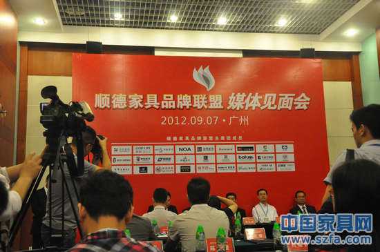 2012年09月07日,順德家具品牌聯(lián)盟于廣交會(huì)展館A區(qū)花城廳舉行了媒體見(jiàn)面會(huì)。包括廣東電視臺(tái)、廣州電視臺(tái)、《廣州日?qǐng)?bào)》、《南方都市報(bào)》、《羊城晚報(bào)》、《南方日?qǐng)?bào)》、《新快報(bào)》、《信息時(shí)報(bào)》、香港《文匯報(bào)》、《珠江時(shí)報(bào)》、《民營(yíng)經(jīng)濟(jì)報(bào)》、《佛山日?qǐng)?bào)》、《香港商報(bào)》等超過(guò)25家大眾媒體及《亞太家具報(bào)》、《珠三角家具報(bào)》、《000家·財(cái)富》、《政府采購(gòu)信息報(bào)》、天天家具網(wǎng)、新浪網(wǎng)、搜狐網(wǎng)等超過(guò)15家家具行業(yè)的媒體記者朋友到場(chǎng)進(jìn)行采訪(fǎng),中國(guó)家具協(xié)會(huì)理事長(zhǎng)朱長(zhǎng)嶺先生、中國(guó)對(duì)外貿(mào)易廣州展覽總公司總經(jīng)理李德穎先生、廣東省家具協(xié)會(huì)會(huì)長(zhǎng)王克先生、順德區(qū)家具協(xié)會(huì)會(huì)長(zhǎng)黎德先生、順德家具品牌聯(lián)盟主席周振揚(yáng)先生出席了見(jiàn)面會(huì)并發(fā)表了講話(huà),見(jiàn)面會(huì)由順德家具品牌聯(lián)盟高級(jí)顧問(wèn)莊子標(biāo)先生主持。