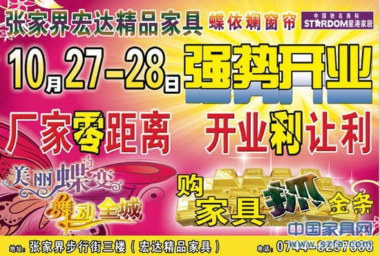 10月27日,張家界宏達(dá)精品家具城強(qiáng)勢(shì)開(kāi)業(yè)。蝶依斕沙發(fā)、蝶依斕窗簾、施華洛、港府太子、星港床墊等眾多品牌紛紛同期開(kāi)業(yè)。開(kāi)業(yè)當(dāng)天的廠家零距離、開(kāi)業(yè)利讓利、購(gòu)家具抓金條等一系列優(yōu)惠深深刺激著當(dāng)?shù)厥忻竦南M(fèi)神經(jīng)。