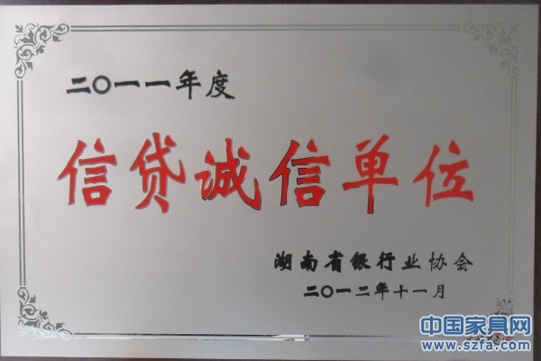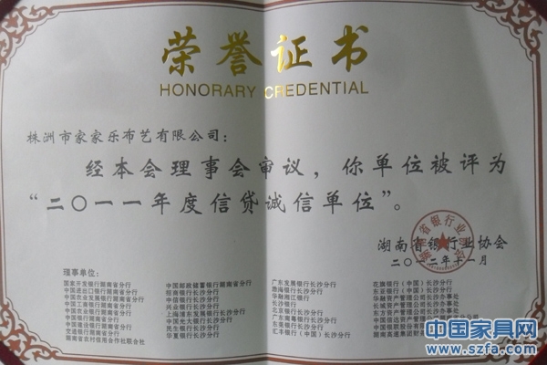 蝶依斕品牌旗下株洲市家家樂(lè)布藝公司榮獲“2011年度信貸誠(chéng)信單位”稱(chēng)號(hào)