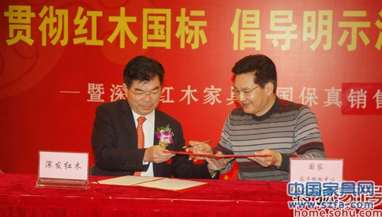 會(huì)議首先進(jìn)行簽約環(huán)節(jié)。深發(fā)紅木董事長(zhǎng)張祝林、中國(guó)林科院木材工業(yè)研究所所長(zhǎng)助理、中國(guó)林產(chǎn)工業(yè)協(xié)會(huì)紅木分會(huì)常務(wù)理事長(zhǎng)呂斌研究員、中國(guó)家具協(xié)會(huì)傳統(tǒng)家具委員會(huì)秘書(shū)長(zhǎng)姜恒夫等分別就深發(fā)紅木簽約保真銷(xiāo)售進(jìn)行了熱情洋溢的致詞,之后再各方人士的見(jiàn)證下,深發(fā)紅木董事長(zhǎng)張祝林與國(guó)家家具及室內(nèi)環(huán)境質(zhì)量監(jiān)督檢驗(yàn)中心主任羅炘共同簽署了“深發(fā)紅木家具全國(guó)保真銷(xiāo)售協(xié)議”。