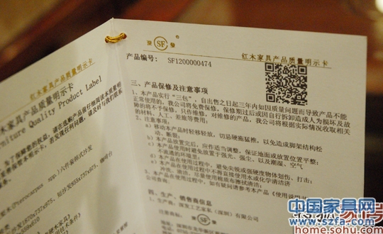 在消費(fèi)者如何區(qū)分紅木家具的“全”與“不全”等問(wèn)題上行業(yè)專(zhuān)家也給出了詳盡的答案。而對(duì)于在購(gòu)買(mǎi)合同上能否直接標(biāo)稱(chēng)“全紅木家具”的問(wèn)題,中國(guó)林產(chǎn)工業(yè)協(xié)會(huì)紅木分會(huì)秘書(shū)長(zhǎng)殷亞方研究院也給出了“這樣標(biāo)注并不合理”的解釋。 產(chǎn)品質(zhì)量明示卡 產(chǎn)品質(zhì)量明示卡