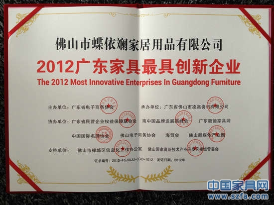 2012年12月28日,由廣東省電子商務(wù)協(xié)會舉辦的,廣東家具行業(yè)創(chuàng)新頒獎典禮在佛山舉行。數(shù)百家業(yè)內(nèi)代表企業(yè)精英齊聚,共襄盛舉。佛山市蝶依斕家居用品有限公司榮獲2012廣東家具最具創(chuàng)新企業(yè)殊榮。