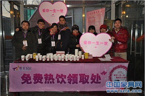 今天清晨天氣比較寒冷,記者穿著厚厚的羽絨服依然覺得寒意逼人。來到服務點看到,集美家居的工作人員正在為排隊的新人斟上一杯杯熱氣騰騰的咖啡奶茶,在寒夜中彌漫一陣甜蜜的香氣。