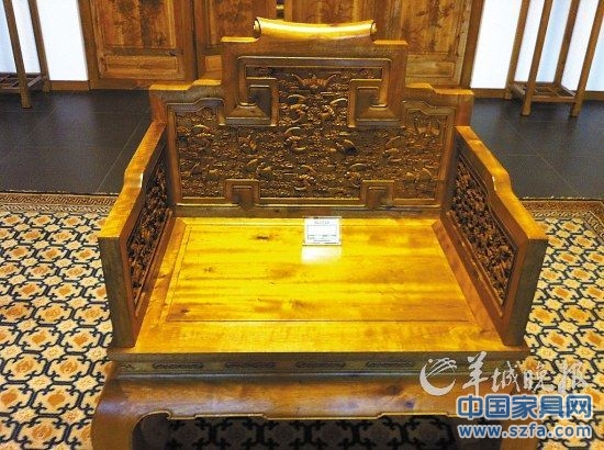 和其他店家相比,該店單門(mén)獨(dú)戶占地頗大,整個(gè)外墻都是紅黃一片,“貴族藝術(shù)”、“中國(guó)皇帝御用”等大字招牌格外醒目。一位自稱姓張的女店員接待了記者,記者指著一張羅漢床問(wèn):“這張床就是電視里的億元羅漢床?”張小姐說(shuō):“這張床是70萬(wàn)元,另外一張是150萬(wàn)元。億元羅漢床在另外一家店里。那個(gè)料好,很老很老的。金絲楠木越老金絲就越多。你要是喜歡,也可以跟老總談。”