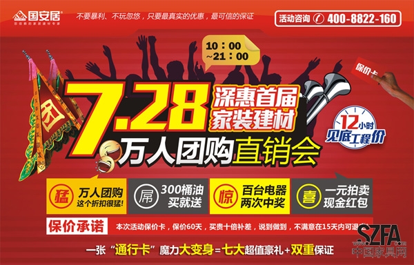據各大報紙和新聞媒體加急報道:7月28日將是惠陽史上最熱的一天,號稱來自惠陽國安居名為“首屆深惠家裝建材萬人團購直銷會”熱流將在惠陽人民四路國安居登陸。這里將聚集深圳、惠州兩地業(yè)主,匯集150余戶國內外一線品牌商家,打造一場史無前例的年度家裝盛會,折扣低至2折,現(xiàn)場融合吃、玩、購物于一體構造一個超大型、火爆的大PARTY。