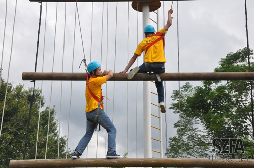 穿上安全服后,學(xué)員們逐個(gè)進(jìn)行高空項(xiàng)目。在搭檔的配合下,隊(duì)員的吶喊鼓勵(lì)下,站在10米高空的每個(gè)人都成功克服心理的恐懼,勇敢挑戰(zhàn)困難,突破自己,激發(fā)了潛能。