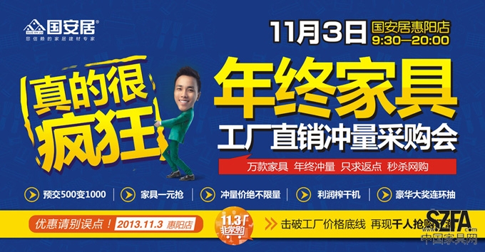 繼中秋十一雙節(jié)鉅惠活動狂攬千余萬之后,11月3日國安居惠陽店家具區(qū)“家具年終工廠直銷沖量采購會”將卷土再來。屆時將展示國內(nèi)外各風(fēng)格、各品類名品家具。更有定金翻倍、豪華大獎等優(yōu)惠活動等您參與,讓您見證并親歷一場由國安居惠城店打造的家具超級盛宴。