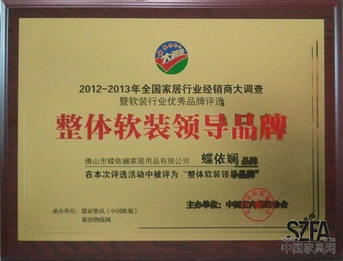 由中國室內裝飾協(xié)會,廣東省家用紡織品行業(yè)協(xié)會主辦的2012-2013年全國家居行業(yè)經銷商大調查暨軟裝行業(yè)優(yōu)秀品牌評選活動已圓滿地落下帷幕。佛山市蝶依斕家居用品有限公司在此次評選活動中榮膺“整體軟裝領導品牌”的稱號。