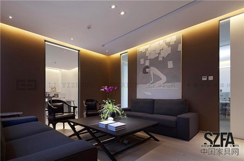 大面積的黑白空間之中,貴賓接待室墻面換了一種深褐色調(diào),木地板鋪裝,布置得更有情調(diào),在工作環(huán)境之中跳脫出來。