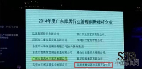 2015年1月6日下午,創(chuàng)享2015“工業(yè)化4.0”時代的家居企業(yè)發(fā)展趨勢及應(yīng)對暨2014年度廣東家居管理及科技進步與知識產(chǎn)權(quán)創(chuàng)新年會,在東莞厚街喜來登大酒店隆重舉行。大會上公布了“2014年度廣東家具行業(yè)管理創(chuàng)新標(biāo)桿企業(yè)”光榮榜,童話森林家具榜上有名。