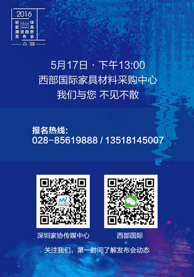 5月17日,2016軟體家具潮流趨勢(shì)發(fā)布會(huì)將在中國(guó)成都西部國(guó)際家具材料采購(gòu)中心華麗啟幕,邀請(qǐng)三位由全球設(shè)計(jì)之都——米蘭歸來(lái)的重量級(jí)設(shè)計(jì)界嘉賓,分別從色彩趨勢(shì)、產(chǎn)品研發(fā)、軟裝配飾三個(gè)角度闡述國(guó)際潮流風(fēng)向。