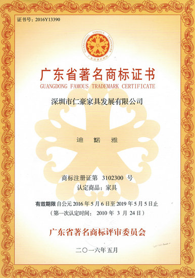 近日,經(jīng)廣東省工商行政管理局下屬著名商標(biāo)認(rèn)定委員會(huì)的嚴(yán)格評(píng)定,仁豪居品旗下品牌“仁豪·迪諾雅”憑借較高的市場(chǎng)口碑和對(duì)原創(chuàng)產(chǎn)品精益制造的嚴(yán)苛標(biāo)注與要求,過(guò)三關(guān)、獲殊榮——“廣東省著名商標(biāo)”榮譽(yù)證書(shū)。