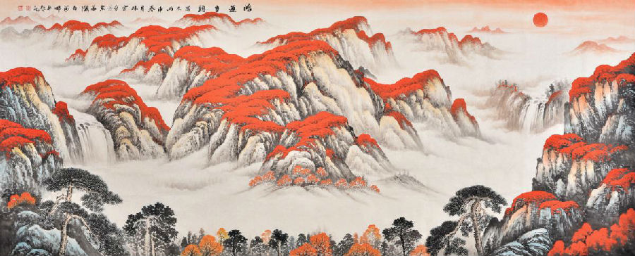 李林宏的這幅《鴻運當(dāng)頭》是一幅鴻運題材的優(yōu)秀的山水畫作品。作品構(gòu)圖大氣、渾然天成,用色巧妙,對比鮮明。祥云漫卷、紅日吉運,一幅祥和之氣鋪滿整個畫面。兩側(cè)溪流從天而來,寓意著財源不斷,源水長流。畫中的大山綿延遠(yuǎn)大,預(yù)示著畫的主人前程遠(yuǎn)大、潛力無限。其創(chuàng)作的“鴻運”主題風(fēng)水畫深受各界收藏人士的喜愛,被大家廣泛收藏。這幅作品是辦公室風(fēng)水畫或居家客廳背景墻最好的國畫選擇作品。