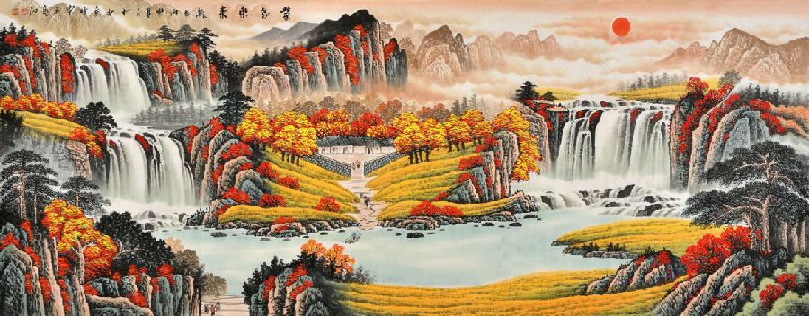 聚寶盆,顧名思義為聚財風(fēng)水畫,行運吉祥,無論為客廳背景墻、或書房,祥和,瑞氣,畫卷氣勢磅礴,流溢著生命的激情,跳動著生命的神韻,迸發(fā)對山川大地的詠唱,對自然精神的觀照。大地理風(fēng)水格局,講究的是左青龍、右白虎、前朱雀、后玄武,具體的格局為:背倚玄武——主山,是連綿起伏的群山,也就是所謂龍脈;兩側(cè)有重重山脈相拱衛(wèi),即“青龍”“白虎”;前有朱雀——前有開闊水面,河水蜿蜒而繞過,預(yù)示著財運滾滾,源遠(yuǎn)流長。是非常不錯的掛客廳背景墻風(fēng)水山水畫。