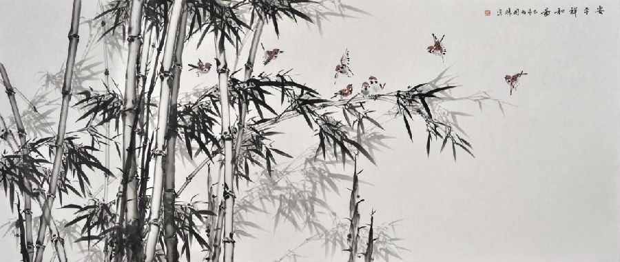 竹,有著不一般的中國傳統(tǒng)文化含義,竹子四季常青象征著頑強(qiáng)的生命、青春永駐;竹子空心代表虛懷若谷的品格;其枝彎而不折,是柔中有剛的做人原則;生而有節(jié)、竹節(jié)必露則是高風(fēng)亮節(jié)的象征。竹的挺拔灑脫、正直清高、清秀俊逸也是中國文人的人格追求。在國畫中,竹與梅花、喜鵲畫在一起,有愛情長久、幸福美滿的美好的寓意。所以這幅李國勝的《安平祥和圖》特別適合掛在夫妻臥室。