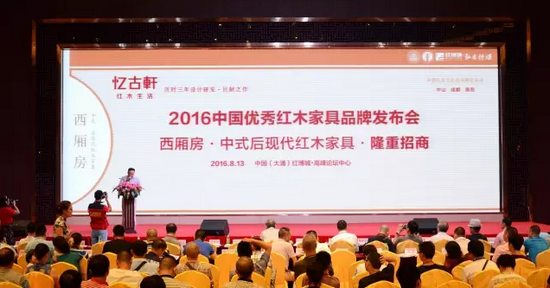 8月13日,2016品牌紅木家具經(jīng)銷商大會(huì)最為重要的環(huán)節(jié)——2016中國(guó)優(yōu)秀紅木家具品牌發(fā)布會(huì)在中國(guó)(大涌)紅木文化博覽城(以下簡(jiǎn)稱紅博城)六層高峰論壇中心召開(kāi),眾多優(yōu)秀紅木家具經(jīng)銷商以及紅木家具企業(yè)到場(chǎng)參與。