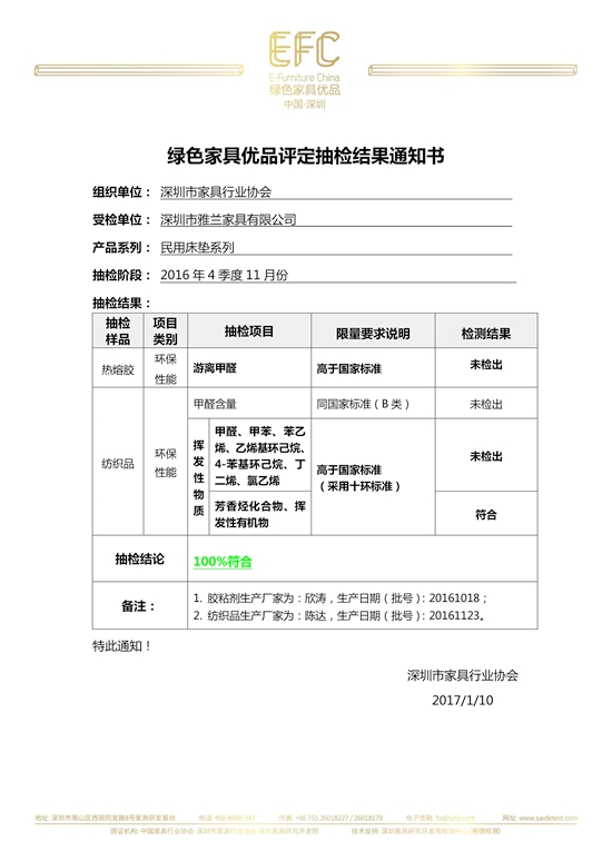 中國綠色家具優(yōu)品工作啟動以來,抽檢工作在深圳家具研究開發(fā)院檢測中心(賽德檢測)主導(dǎo)下有條不紊的進行。2017年初,2016年4季度11月份的抽檢工作圓滿完成,深圳市雅蘭家具有限公司民用床墊系列抽檢結(jié)果100%符合。