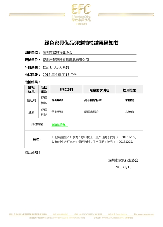 2017年1月10日,2016年中國綠色家具優(yōu)品四季度12月抽檢結果正式公布,深圳市新福牌家具用品有限公司杜莎D.U.S.A系列被抽取的膠粘劑、油漆兩款關鍵原材料的甲醛含量與甲醛釋放量均達到優(yōu)品技術要求,合格率100%。