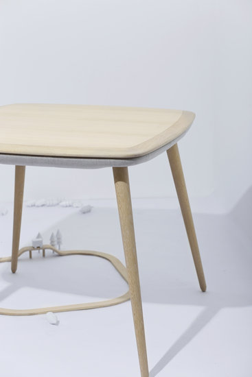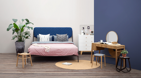 它有趣又好玩。桌面底部設(shè)置了布藝軟包,粉晶色的紐扣鑲嵌在淺灰色的軟包中,看上去就像一塊方形大餅干。桌腿向外傾斜,桌底“玩樂區(qū)”比普通桌底更寬敞。