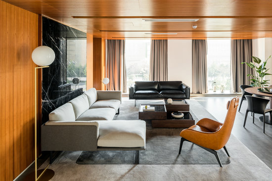 展廳總共一千多平方米,分為兩層。底層主要承擔(dān)空間展示的功能,劃分成10個依照功能而劃分的區(qū)域;邀請杭州室內(nèi)設(shè)計團(tuán)隊“余論設(shè)計”進(jìn)行空間設(shè)計,建筑內(nèi)部工業(yè)感十足;黑白雙色大理石的大面積采用,集簡約線條與奢華質(zhì)感于一身,為展廳奠定大氣的主調(diào);半敞開的空間設(shè)計,方便參觀,又具備所有家居元素。