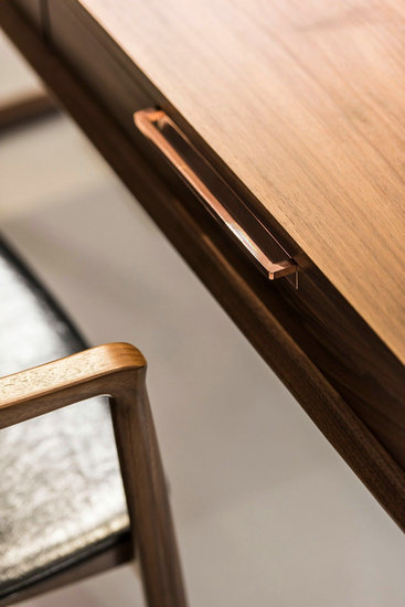 硯臺書桌,三面圍合,從硯臺獲得靈感。采用牛皮系帶和黃銅扣件制作的翻蓋面板拉手,減少了拉手與手的摩擦,并調(diào)整與桌面板的關(guān)系;金屬把手的運用,將金屬與木材相結(jié)合,開創(chuàng)了MZGF木智工坊的歷史;MDF(中密度纖維板)實木貼皮工藝,避免實木開裂、純板式家具木皮易爆邊、脫落的問題,縮小了傳統(tǒng)實木工藝色差,增加了美感。
