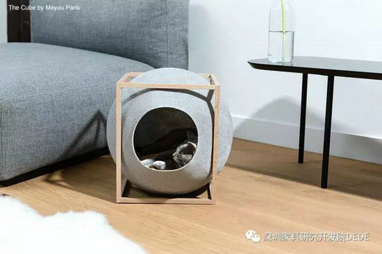 上圖的立方體成了完美的避難所,我們毛茸茸的朋友蜷縮在里面,感到很安全。這個(gè)產(chǎn)品呈現(xiàn)出完美的形式感和平衡感:一個(gè)軟織物安置在金屬框架里。球在MEYOU的這個(gè)系列里是一個(gè)重復(fù)出現(xiàn)的造型,使用了木材則更加天然,且充分考慮到避免刮傷的范圍。貓咪的床和主人的床高度一致,可以放在他們主人的床旁邊,它們可以毫不費(fèi)力地爬過來陪主人睡覺了。