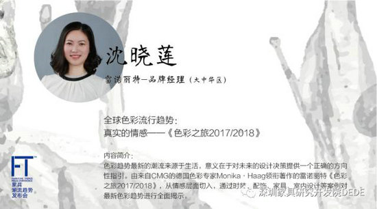今年,研發(fā)院首次特邀全球色彩潮流趨勢(shì)專業(yè)領(lǐng)域權(quán)威,“德硅·雷諾麗特”大中華區(qū)品牌經(jīng)理沈曉蓮女士為深圳首發(fā)站帶來(lái)《全球色彩流行趨勢(shì):真實(shí)的情感——色彩之旅2017-2018》。相信2017FT發(fā)布會(huì)·深圳站將是潮流研究和應(yīng)用的一場(chǎng)盛宴。