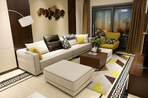 布拉格_SP-B1703A布藝沙發(fā)外形簡(jiǎn)約大氣,優(yōu)雅的時(shí)尚灰,搭配褐色靠枕、黃色和抽象線條抱枕點(diǎn)綴其中,透著一股現(xiàn)代溫馨的氣息,恰到好處地彰顯出主人不凡的生活品味。