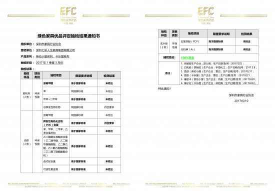 2017年,作為“中國綠色家具優(yōu)品”首批獲證企業(yè),深圳市家具行業(yè)協(xié)會(huì)檢測(cè)中心(賽德檢測(cè))針對(duì)七彩人生家具的品質(zhì)抽檢工作進(jìn)入第三個(gè)年頭。6月10日,今年第一季度3月份的抽檢工作完成,七彩人生各項(xiàng)抽檢結(jié)果均達(dá)到100%的合格率。