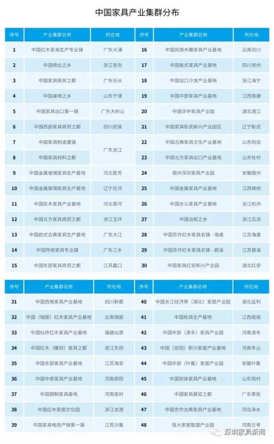 中國目前有五大家具產業(yè)集群區(qū),分別為珠江三角洲家具產業(yè)區(qū)、長江三角洲家具產業(yè)區(qū)、環(huán)渤海家具產業(yè)區(qū)、東北家具產業(yè)區(qū)和西部家具產業(yè)區(qū),這五者集中了中國90%的家具產能。這五大家具產業(yè)集群區(qū)又劃分為更加具體的48個產業(yè)集群。
