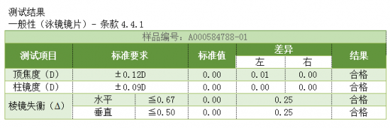 抽檢結(jié)果: 第一項(xiàng)測(cè)試結(jié)果顯示捷佳泳鏡頂焦度為±0.01,優(yōu)于歐盟±0.1以上;