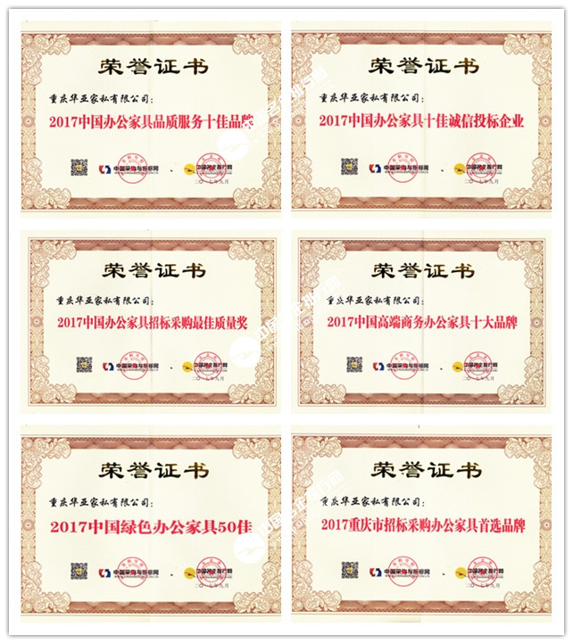 為檢驗公司市場競爭力,為政府機構、項目業(yè)主在招投標方面提供更具針對性的服務,華亞家私每年都會參加中國采購與招標網(wǎng)、中國名企排行網(wǎng)聯(lián)合舉辦的辦公家具招標采購評價推介活動。在“2017第九屆中國辦公家具招標采購評價推介活動”中,通過對企業(yè)銷售額、總資產(chǎn)、稅后利潤、中標金額、注冊資金、經(jīng)營年限等10余項數(shù)據(jù)的核對、分析、對比,經(jīng)過專家的綜合評審,最終獲得“中國高端商務辦公家具十大品牌”、“中國辦公家具十佳誠信投標企業(yè)”、“中國辦公家具品質(zhì)服務十佳品牌”、“中國綠色辦公家具50佳”、“中國辦公家具招標采購最 佳質(zhì)量獎”、“重慶市招標采購辦公家具首選品牌”。這是華亞家私24年如一日建立起來的成果,以大數(shù)據(jù)為依托的評價,是對華亞家私最公正的評價。