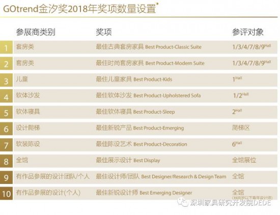 金汐獎(jiǎng)植根于深圳國(guó)際家具展展會(huì)平臺(tái),為均衡推進(jìn)家具行業(yè)各細(xì)分領(lǐng)域的設(shè)計(jì)進(jìn)步,2018年獎(jiǎng)項(xiàng)設(shè)置將家具細(xì)分為時(shí)尚套房、古典套房、軟體沙發(fā)、軟體寢具、兒童和軟裝陳設(shè)六個(gè)領(lǐng)域的六個(gè)獎(jiǎng)項(xiàng),同時(shí)針對(duì)深圳展特色展區(qū)設(shè)計(jì)爬梯區(qū)設(shè)置最佳新銳產(chǎn)品獎(jiǎng),針對(duì)全館展位設(shè)置最佳展示設(shè)計(jì)獎(jiǎng),針對(duì)所有參展作品的設(shè)計(jì)團(tuán)隊(duì)新增最佳設(shè)計(jì)師/團(tuán)隊(duì)、最佳新銳設(shè)計(jì)師獎(jiǎng)項(xiàng)。